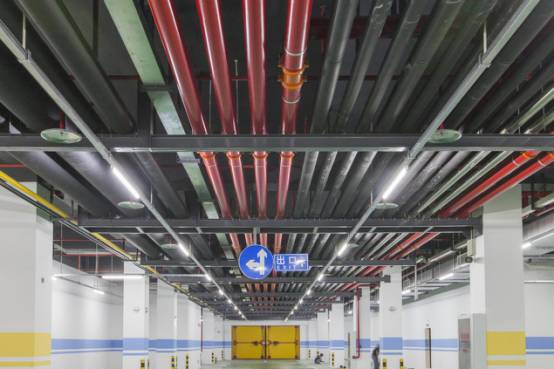 車庫管線排布美觀,聯(lián)合支吊架安全可靠,管道居套管中,燈帶線槽平直,噴淋布置間距一致,標(biāo)識清晰。