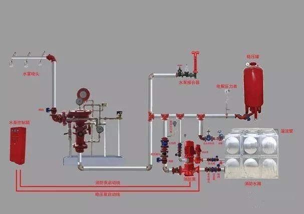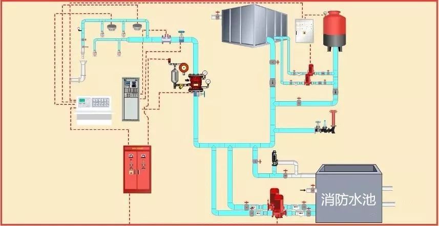 1、消防水池、消防水泵、水泵接合器、消防水箱(參見消火栓系統(tǒng))。用氣壓罐代替高位消防水箱,消防水箱的出水管未與報警閥前的管道連接。