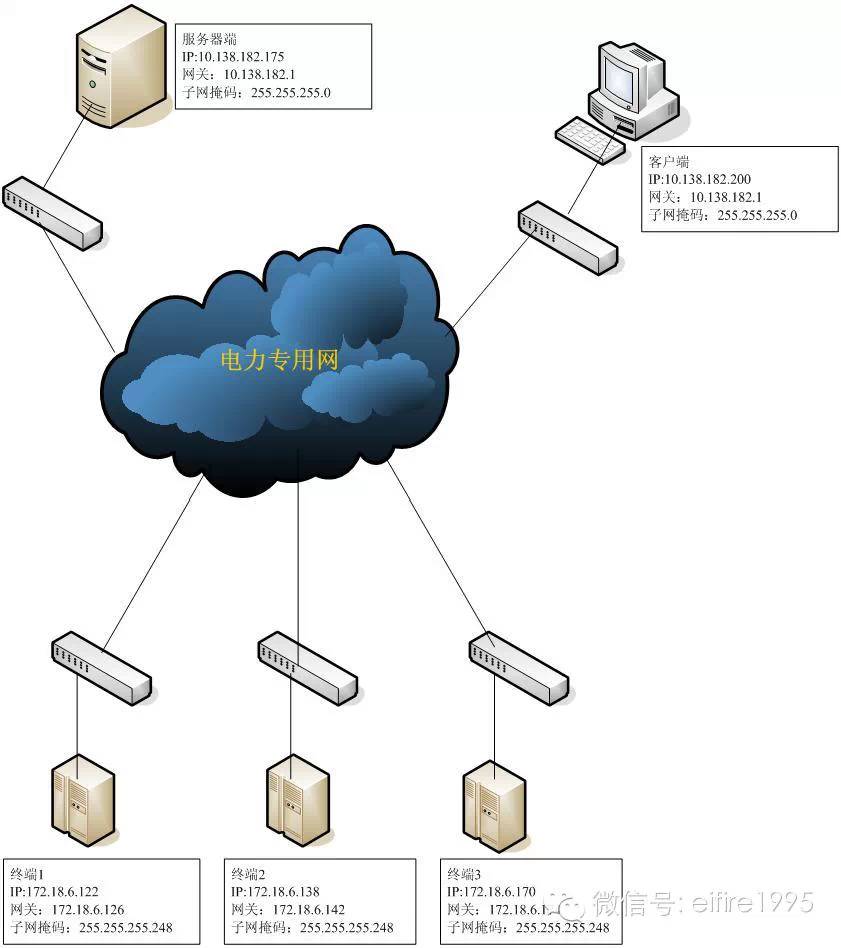 到達現(xiàn)場后,供電公司給出了如下圖所示的三個終端網(wǎng)絡(luò)參數(shù)、一個服務(wù)器端網(wǎng)絡(luò)參數(shù)、一個客戶端網(wǎng)絡(luò)參數(shù)(具體網(wǎng)絡(luò)結(jié)構(gòu)尚不清楚,初步簡化為下圖)。