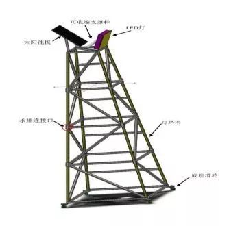 一種可移動式太陽能施工照明燈,包括一個可移動式燈塔架、太陽能蓄電池板及LED燈,每個燈塔架包括由一個可移動底座、4到6個可組裝式燈塔節(jié),所述可組裝式燈塔節(jié)每個高1m,上下成椎體,最大燈塔節(jié)邊長為1米,最小燈塔節(jié)邊長為0.4米,可移動式底座由4個萬向輪組成,每個萬向輪均設置鎖定裝置,移動時將鎖定裝置解鎖方可移動。