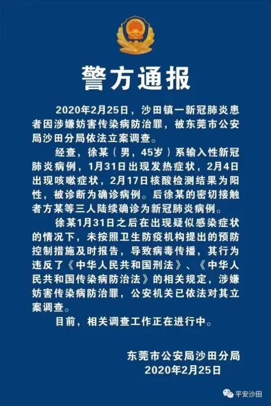 日前,東莞市沙田首例確診患者徐某,發(fā)病后未及時報告,導(dǎo)致與其密切接觸的方某等3人確診,涉嫌防害傳染病防治罪被立案調(diào)查。