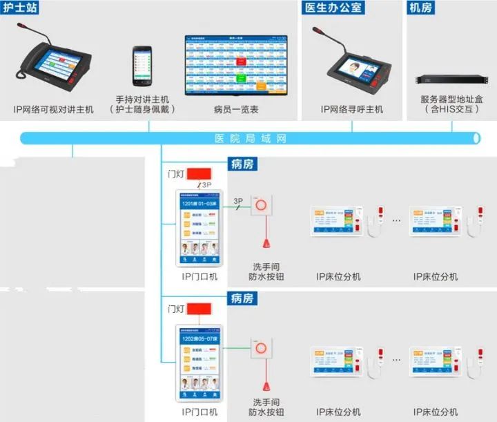 系統(tǒng)采用網(wǎng)絡(luò)式架構(gòu);病房每個床頭設(shè)置1臺IP床位分機(jī),洗手間設(shè)置防水按鈕;每個病房門口設(shè)置1臺IP門口機(jī);護(hù)士站設(shè)置對講主機(jī)和顯示屏;醫(yī)生辦公室設(shè)置對講主機(jī)。