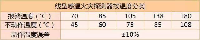 纜式線型感溫火災探測器即感溫電纜,感溫電纜一般由微機處理器、終端盒和感溫電纜組成,根據(jù)不同的報警溫度感溫電纜可以分為70℃、85℃、105℃、138℃、180℃(可以根據(jù)不同的顏色來區(qū)分)等等。根據(jù)使用方式不同還可以分為可恢復式和不可恢復式。