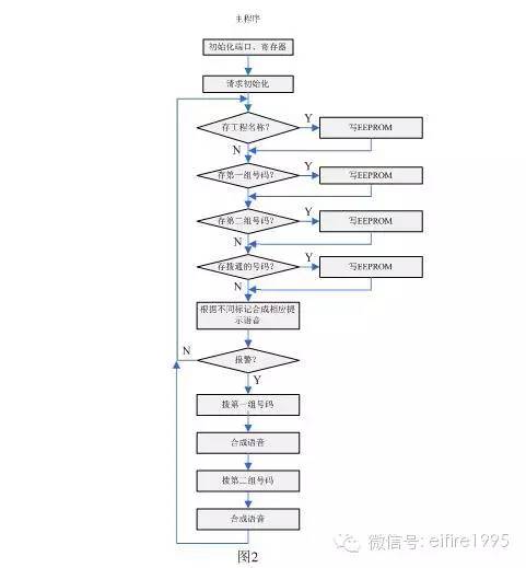 主程序主要完成初始化、存儲工程名稱及電話號碼、合成反映系統(tǒng)運行狀態(tài)的提示語音、撥打預(yù)設(shè)的電話、合成報警語音等。其框圖如圖2所示。
