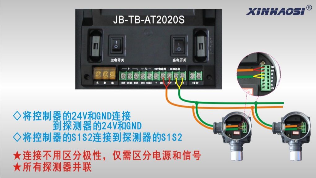 我們總線制的探頭采用的是我司自主研發(fā)設(shè)計(jì)的HBUS四總線通訊,控制器以及探頭上都有相對(duì)應(yīng)的24V、GND、S1、S2四個(gè)接線端子,只需將四個(gè)接線端子對(duì)應(yīng)相接即可;