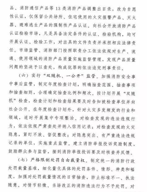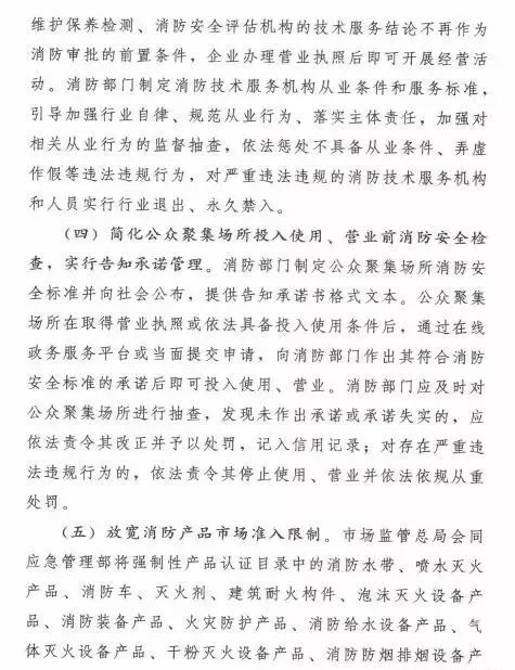 在簡政放權(quán)方面,取消和精簡3項消防審批。一是取消消防技術(shù)服務(wù)機構(gòu)資質(zhì)許可,取消消防設(shè)施維護保養(yǎng)檢測、消防安全評估機構(gòu)資質(zhì)許可制度,企業(yè)辦理營業(yè)執(zhí)照后即可開展經(jīng)營活動。二是簡化公眾聚集場所投入使用、營業(yè)前消防安全檢查,實行告知承諾管理,公眾聚集場所作出其符合消防安全標(biāo)準(zhǔn)的承諾后即可投入使用、營業(yè)。三是放寬消防產(chǎn)品市場準(zhǔn)入限制,將強制性產(chǎn)品認(rèn)證目錄中的13類消防產(chǎn)品調(diào)整出目錄,改為自愿性認(rèn)證,僅保留公共場所、住宅使用的火災(zāi)報警產(chǎn)品、滅火器、避難逃生產(chǎn)品的強制性產(chǎn)品認(rèn)證;向社會開放消防產(chǎn)品認(rèn)證、檢驗市場,凡是具備法定條件的認(rèn)證、檢驗機構(gòu),均可開展認(rèn)證、檢驗工作。消防部門制定消防技術(shù)服務(wù)機構(gòu)從業(yè)條件和服務(wù)標(biāo)準(zhǔn)、公眾聚集場所消防安全標(biāo)準(zhǔn),引導(dǎo)加強行業(yè)自律、規(guī)范從業(yè)行為,加強監(jiān)督抽查,依法懲處違法違規(guī)行為,對嚴(yán)重違法違規(guī)的實行行業(yè)退出、永久禁入或者責(zé)令停止使用、營業(yè)。