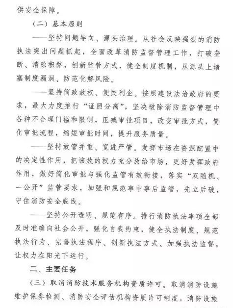 《意見》明確,消防執(zhí)法改革要堅持問題導(dǎo)向、源頭治理,從社會反映強烈的消防執(zhí)法突出問題抓起,全面改革消防監(jiān)督管理工作,從源頭上堵塞制度漏洞、防范化解風(fēng)險;堅持簡政放權(quán)、便民利企,最大力度推行“證照分離”,堅決破除消防監(jiān)督管理中各種不合理門檻和限制,提升服務(wù)質(zhì)量;堅持放管并重、寬進嚴(yán)管,把該放的權(quán)力充分放給市場,做好簡化審批和強化監(jiān)管有效銜接,加強和規(guī)范事中事后監(jiān)管,守住消防安全底線;堅持公開透明、規(guī)范有序,健全執(zhí)法制度、規(guī)范執(zhí)法行為、完善執(zhí)法程序、創(chuàng)新執(zhí)法方式、加強執(zhí)法監(jiān)督,讓權(quán)力在陽光下運行。同時,提出了消防執(zhí)法改革5個方面12項主要任務(wù)。