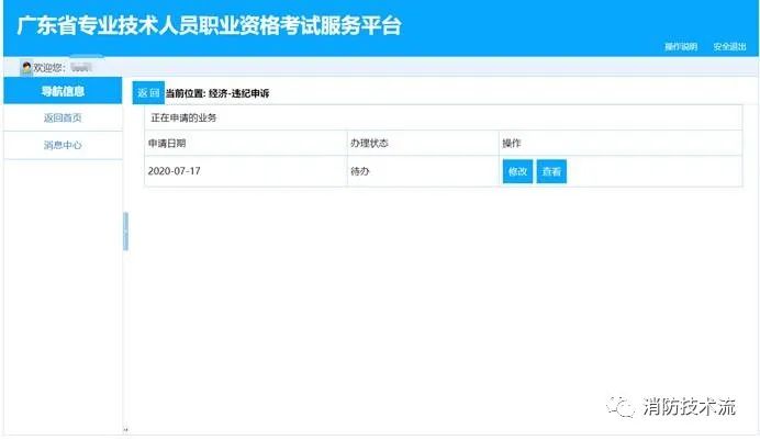 3.消息查看。申請的業(yè)務有新的反饋動態(tài)時,例如申請已受理、申請已辦結(jié)、申請需要修改補充材料等,左側(cè)【導航信息】菜單中的【消息中心】中會有閃動提示,并且顯示新信息條數(shù),例如【消息中心(1)】。