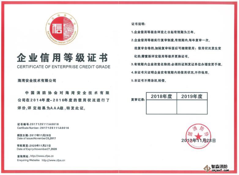 海灣消防公司再次獲評消防行業(yè)AAA級信用企業(yè)稱號
