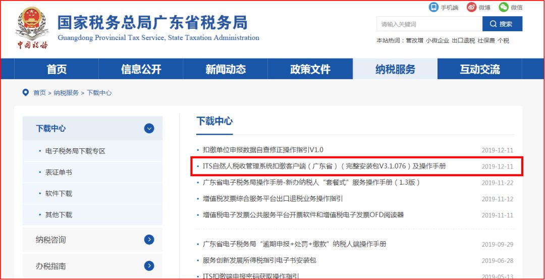訪問廣東省稅務局門戶網(wǎng)站首頁,依次點擊“納稅服務 > 下載中心 > ITS自然人稅收管理系統(tǒng)扣繳客戶端(廣東?。ㄍ暾惭b包V3.1.076)及操作手冊”,如下圖: