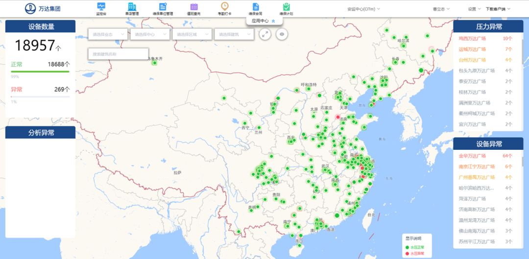 首先是巨大的中國地圖,萬達(dá)管理的全國所有廣場、酒店、樂園等在營業(yè)的物業(yè)一覽無余,綠色的點(diǎn)代表一切運(yùn)轉(zhuǎn)正常,如果出現(xiàn)紅色則代表著某個(gè)環(huán)節(jié)出現(xiàn)了隱患,激活了報(bào)警。