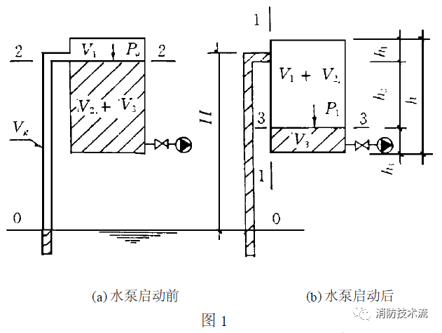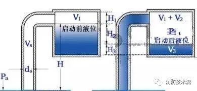 水泵啟動前,真空引水罐內(nèi)的水應灌至真空引水罐能做到的大存水量,此時罐內(nèi)部由水+空氣兩部分構(gòu)成,液面上方的氣體容積為V1。罐內(nèi)外的壓力與大氣壓力Pa相同。