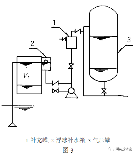 如圖三所示, 當補氣罐及水泵出水管上止回閥以前的管道水容積較小時(小于真空罐容積V2時)停泵后,在補氣罐補氣過程中,外界空氣有可能進入真空罐,破壞了真空度,待下次啟泵時不出水。這種情況在實際工程中曾發(fā)生過,后將補氣罐容積加大而解決。解決方法可適當加大補氣罐容積或增加一個浮球式補水箱。