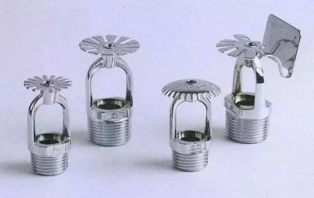 自動噴頭是閉式自動噴水滅火系統(tǒng)的關(guān)鍵組件,系通過熱敏感釋放機構(gòu)的動作而噴水。它由噴水口、溫感釋放器(控制器)和濺水盤組成,其形狀和樣式較多,下圖為常用的低熔點金屬控制器自動噴頭和爆炸瓶式自動噴頭。