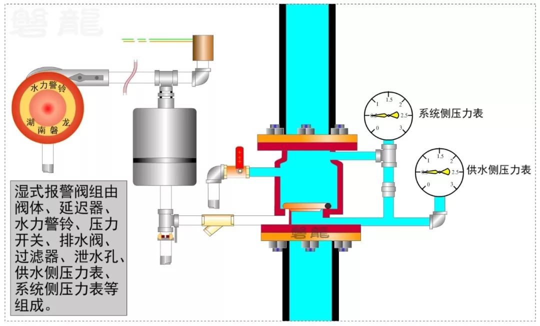 2、濕式報警閥的供水側(cè)和系統(tǒng)側(cè)都設(shè)置有壓力表,系統(tǒng)側(cè)壓力表指示系統(tǒng)側(cè)出口壓力,供水側(cè)壓力表指示供水側(cè)入口壓力。